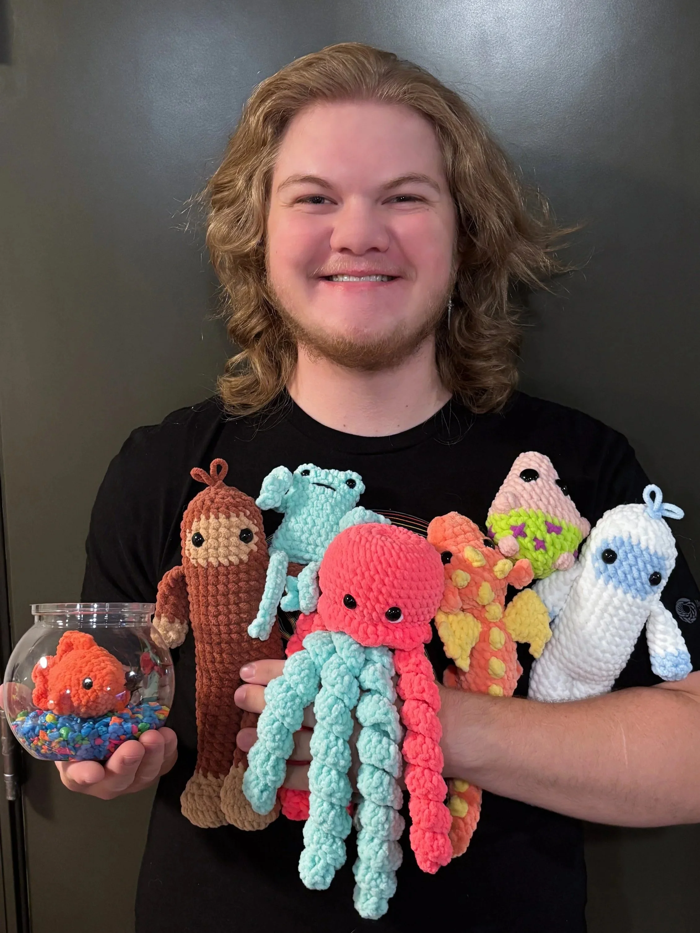 My name is Jack and I own Jack’s Fuzzy Buddies! I am a queer college student getting a nursing degree. Crocheting has been my safe space throughout my transition, my battle with chronic illness, school, and every stage of my life for the past six years. Each fuzzy buddy is made from soft yarn and handcrafted with the intention of spreading joy!